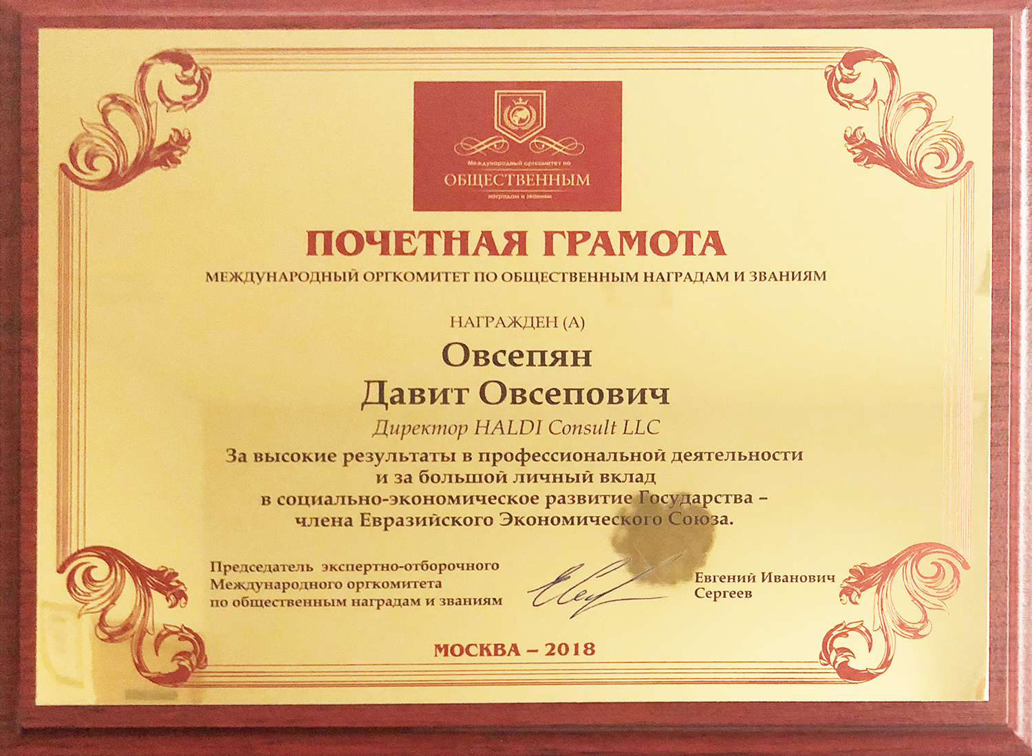 We sincerely congratulate “HALDI Consult” LLC and the team of the company headed by David Hovsepyan for the high public assessment of the results of activities.