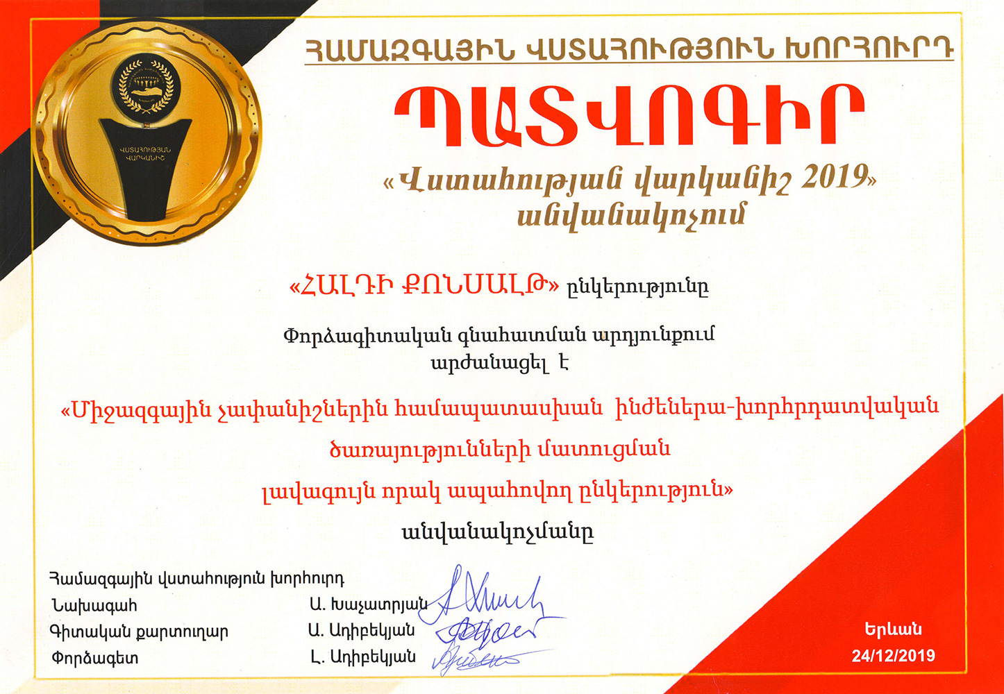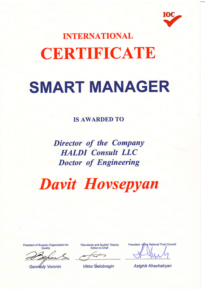 The National Trust Board highly appreciated the work carried out by HALDI CONSULT LLC and, as a company providing the best quality of engineering-consulting services in line with International standards, HALDI CONSULT LLC was awarded the "Trust Rating 2019" Certificate. As well as the Director of HALDI CONSULT LLC, Davit Hovsepyan was awarded the Smart Manager International Certificate.