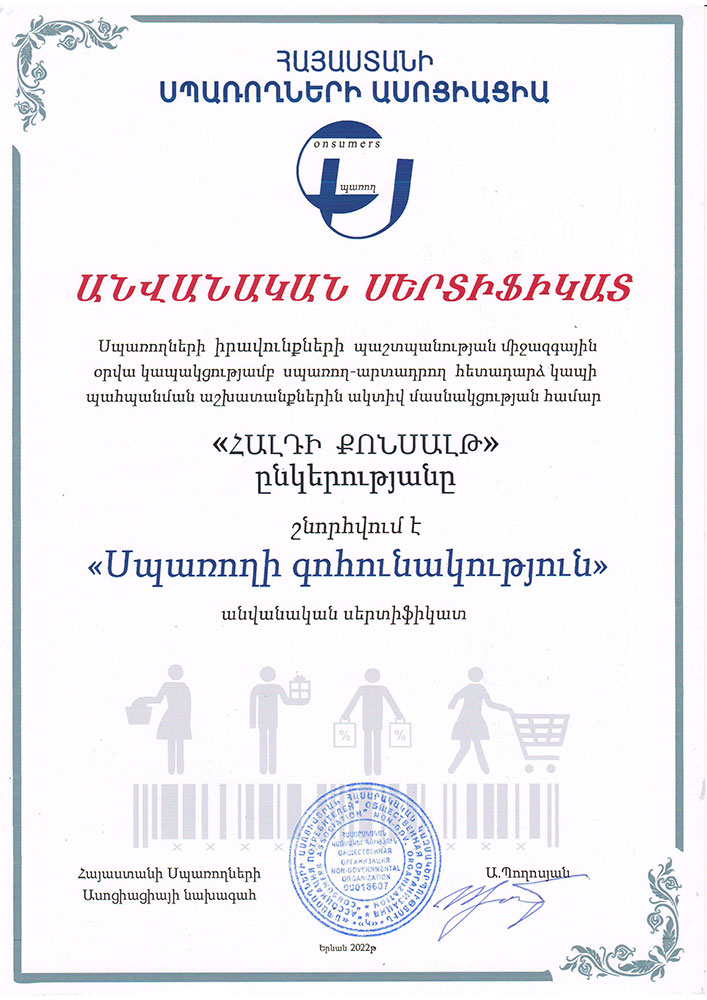 HALDI COUNSULT LLC was awarded the "Consumer Satisfaction" Nominal Certificate for active participation in the protection of consumer-producer feedback on the occasion of the International Consumers’ Protection Day.