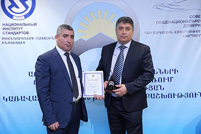 RA governmental 2016 award ceremony in the sphere of quality assurance of products and services took place on the 3d of March. The award ceremony was organized by the RA Ministry of Economic Development and Investments, National Institute of Standards CJSC and National Trust Council.